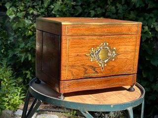 Antigua licorera francesa tipo Cave à Liqueur del periodo Napoleón III (circa 1860-1880), concebida para el servicio de licores y puros en salones burgueses del siglo XIX. Realizada en madera noble en caoba con fina marquetería artesanal de tradición parisina. Apertura completa con compartimentos laterales basculantes destinados a puros y alojamiento central con cristalería completa. Conserva cerradura funcional. Presenta pequeñas faltas de marquetería propias de su antigüedad que no afectan a su estética ni solidez. Medidas cerrada: 30,5 × 23 × 23,5 cm Abierta: 61 × 26 × 41,5 cm Peso: 4,6 kg