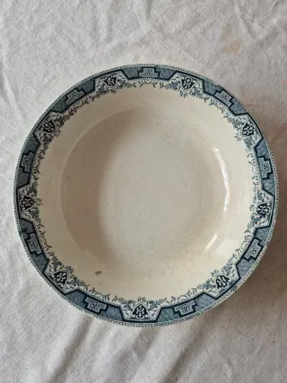 Preciosa ensaladera o frutero de loza francesa antigua de la casa Saint Amand. Su diseño clásico y elegante lo convierte en una pieza decorativa única. - Borde decorado con motivos florales y geométricos en azul. - Tonos crema y blanco en el interior. - Ideal para coleccionistas o amantes de la vajilla vintage.