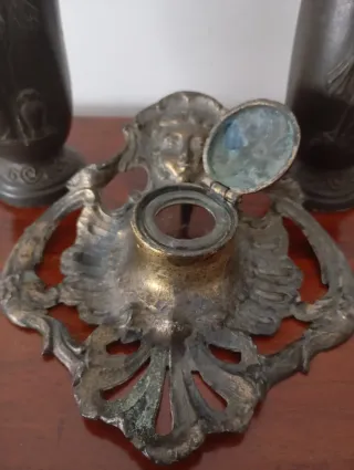Espectacular escribanía de metal de estilo Napoleón III, procedente de Francia y finales del siglo XIX, año 1880. Bella escribanía de mujer, con rostro de dama, rodeada de decoración vegetal y preciosa pátina. Altura: 15 cms. Anchura: 14 cms. Envíos a toda España.