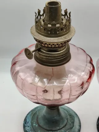 Par de lámparas de aceite de estilo francés, con un encantador diseño. Altura 24 cm. - Cuerpo de cristal en tono rosado, diámetro 26cm. - Base y detalles metálicos con pátina de 11,5 cm de diametro. - Mecanismo de mecha visible.