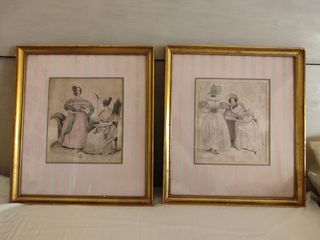 Pareja de litografías francesas del Siglo XIX (1830) que representan la moda femenina de la época, enmarcadas con marco dorado envejecido y paspartous de finas rayas. El reverso de los cuadros conserva el papel original. Ideales para decorar un rincón especial del dormitorio, un vestidor o tienda de ropa.