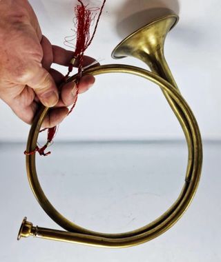 Corneta francesa de laton . Tradicionalmente, se soplaba un cuerno para señalar el fin de una cacería exitosa. Medidas 32,5x21cm
