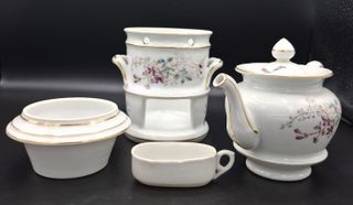 Escalfeta o veilleuse en porcelana francesa en buen estado y completa. Decorada con finos motivos florales. Medidas completa 25x15,5x10cm