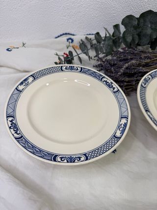 Elegante pie de tarta antiguo de loza francesa, perteneciente al modelo Yvetot, producido por Keller & Guérin Lunéville a finales del siglo XIX y principios del XX. El modelo Yvetot se caracteriza por su cenefa azul de inspiración neoclásica, con motivos geométricos y vegetales sobre fondo marfil. Un diseño sobrio, equilibrado y atemporal, pensado para mesas elegantes y piezas de uso cotidiano refinado. Diámetro: 22 cm • Altura: 7 cm Disponibles dos unidades: • Pieza en muy buen estado 35€ • Pieza con pelo fino 25€. Por favor, revise bien las fotografías, ya que son parte importante Ideal como pie de tarta, para servir postres,