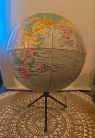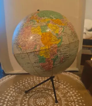 Bola del mundo francesa. Fabricante Girard et Barrère Época del diseño De 1950 a 1959 Tiene desgastes, marcas del uso, tiempo y otros signos de antigüedad. Materiales Metal, Cartón Ancho 16 cm Profundidad 20 cm Altura 22 cm Tags: Cartes taride carles dalmau globo globus erlbol columbus carles dalmau mapa mural escolar planisferio.