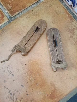 Conjunto de dos herramientas antiguas de madera tallada a mano. Presentan un diseño intrincado y detalles decorativos. TODO por 225€ - Material: Madera. - Castañuelas Vintage. - Faltriquera. - Decoración: Tallado artesanal con motivos geométricos y florales. - Cuerda: Incluyen ataduras de cuerda para su sujeción. Las dos por 225€