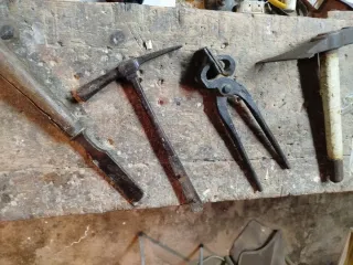 Conjunto de herramientas antiguas, ideales para coleccionistas o para quienes aprecian la artesanía tradicional. - Herramientas de carpintería. - Herramientas de fragua. - Gubias, cepillos, sargentos y azuela. - Yunque, tenazas y martillos. - Hachas y mazas. - Básculas romanas, planchas y ganchos.