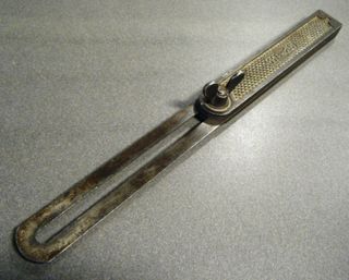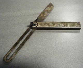 Herramienta de medición antigua, un angulómetro. - Marcaje MB-25 visible. - Construcción metálica robusta. - Diseño articulado para ajuste de ángulos.