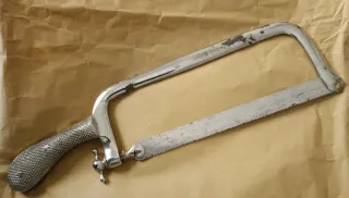 Herramienta de corte antigua con mango texturizado. - Hoja de sierra metálica. - Marco de metal plateado.