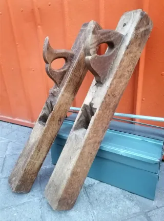 IMPRESIONANTES HERRAMIENTAS para desbastar y nivelar madera, TALLADOS DE UNA PIEZA en madera durisima, enormes y pesados para TRABAJO DE PRECISIÓN . Sin las cuchillas. Usables para carpintería - ebanistería - artesanía o para decoración y coleccionismo. 58 x 9 x 21cm y 58 x 8 x 19cm. Algunas mellas (80 años de antigüedad). 2 x 50e