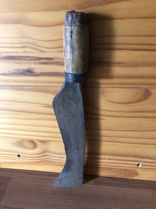Herramienta antigua con mango de madera y hoja de metal. - Mango de madera desgastado. - Hoja de metal - Anilla metálica de sujeción.