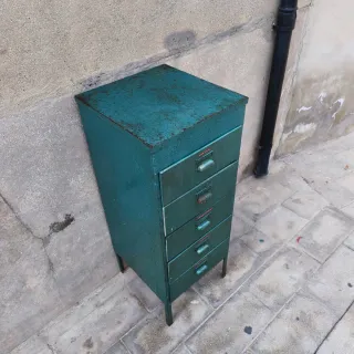 Archivador metálico de los años 50 con cinco cajones en madera. Se encuentra en buen estado sin polillas. Limpio completamente. Mantiene la patina de origen. Color verde metalizado. Diseño vintage industrial, super retro. Medidas 41 cm. X 39 cm. De ancho x 101 cm. De altura. Vendo más cosas interesantes. Tengo local en Alicante con muchas más cosas. También alquilo. Sígueme en @eltrasterodenico. REALIZO ENVIOS