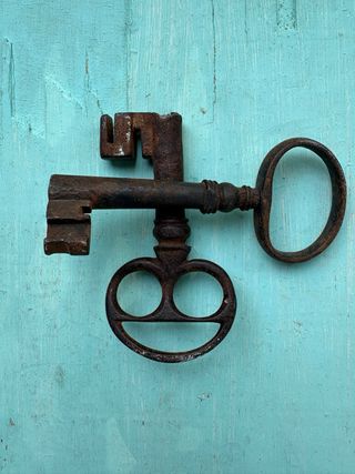 Pareja de llaves en hierro forjado. Pátina antigua con el encanto de lo viejo. Muchos detalles en su diseño. Medidas: 8,5 y 7,5 cm de largo. ATIENDO OFERTAS. Llaves bargueñeras siglo XVIII. Gran surtido en artículos de tendencia retro en mi perfil. Reciclo, recupero y actualizo. Antigüo antigua luminaria aplique fase lupela lámpara antigüedades brocante caña mimbre bambú espejo boho chic industrial nórdico escandinavo mobiliario decoración cerámica porcelana espejo sol latón dorado metal cromado oro madera tallado kitsch marco cuadro escultura manises vajilla 60 70 80 XX midcentury forja aplique original exclusivo rafia mueble mobiliario shabby deco MMM florero jarrón figura atrezzo alquiler escaparate interior interiorismo tendencia diseño XVII XIX XVIII bargueño arca arcón