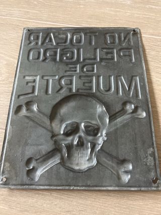 Placa metálica antigua con relieve. Ideal para decoración con aire vintage o industrial. - Advertencia: "No tocar peligro de muerte". - Calavera y huesos cruzados en relieve. - Material: Metal. - Color: Negro.