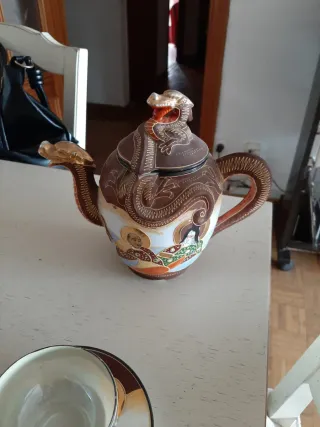 Precioso juego de té de porcelana con un diseño oriental. - Incluye tetera y 6 tazas con sus platos. - Decoración detallada con dragones y figuras. - Fabricado en Japón. Falta tapa de la leche y la dragones un poco descolorido, ver foto. Las tazas y platos perfectos. Tazas muy ligeras, táctica japonesa de "cascara de huevo"