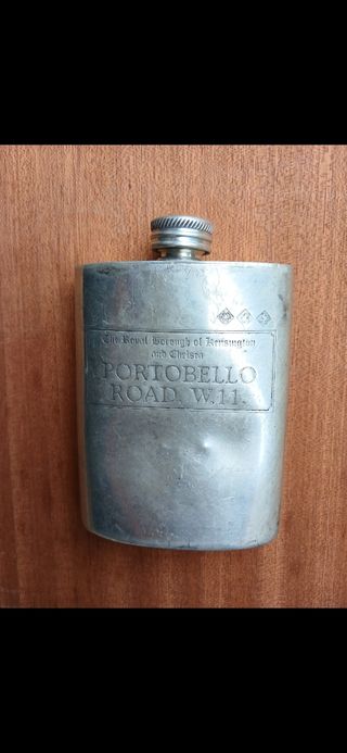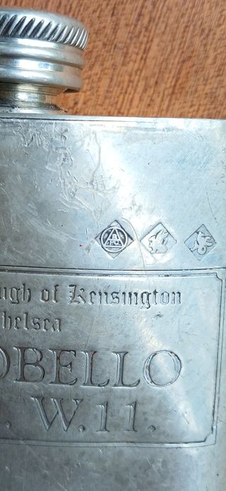 PARA COLECCIONISTAS Petaca de mediados del siglo XX. En sus actuales condiciones no se puede rellenar de líquido puesto que tiene un agujero en la base y una raja a cada lado en la parte de arriba como si las uniones estuviesen despegadas ligeramente. En su estado es para exhibir con otras joyas antiguas como militares, armas o del género antigüedades de bebedor-fumador, etc... CARACTERÍSTICAS : (11×7×2 cm) - 3 SELLOS IDENTIFICADORES. LAS INSCRIPCIONES DE INDICACION : "The Royal Borough of Kensington and Chelsea". "PORTABELLO ROAD W.11.". NACIONALIDAD : "MADE IN SHEFFIELD ENGLAND". Y MÁS DE 100 ARTÍCULOS EN MI PERFIL.