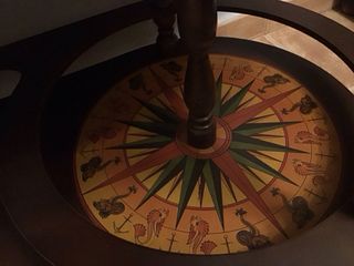 Elegante mueble bar con diseño de globo terráqueo, perfecto para dar un toque de distinción a tu hogar. - Estructura principal de madera. - Globo decorado con mapas y detalles náuticos. - Superficie superior con diseño de mapa antiguo. - Compartimento inferior con diseño de rosa de los vientos. - Con ruedas