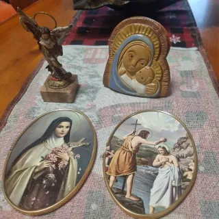 Lote de objetos religiosos antiguos/vintage: • Pareja de cuadros ovalados sin cristal (años 60–70) • Virgen con Niño en cerámica esmaltada • Figura de San Miguel Arcángel en material plástico/goma con peana de mármol (presenta pequeño golpe en una esquina, ver fotos) Piezas ideales para colección, decoración o devoción. Estado general bueno, con signos normales del tiempo. 👉 Se vende todo junto. Mira en mi página tengo muchas cosas antiguas e interesantes que te pueden gustar. Ideal para coleccionistas de objetos antiguos y religiosos. Hago envios por Wallapop opcion correos no IMPOST ni GLS