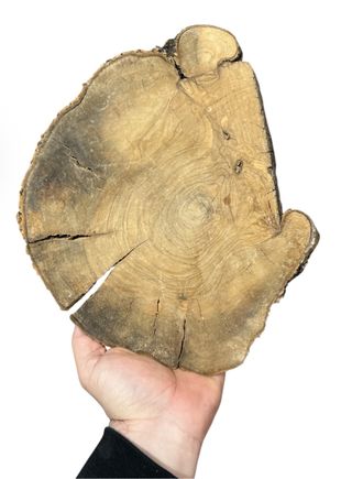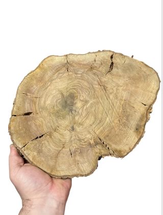 Tabla de madera natural con un diseño rústico y orgánico. Perfecta para decoración o proyectos de manualidades. 28 cm 30 cm - Material: Madera. - Forma irregular. - Textura natural con vetas visibles.