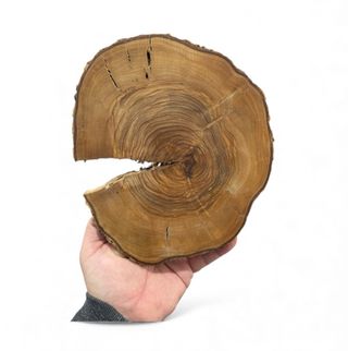 Pieza única de madera de olivo, con un diseño natural y rústico. Ideal para decoración o manualidades. 22x19 cm aproximadamente - Material: Madera de olivo. - Forma: Rodaja irregular. - Textura: Anillos de crecimiento visibles.