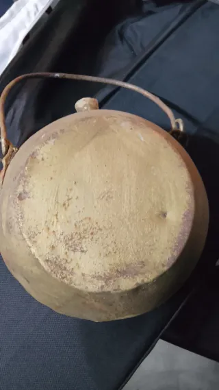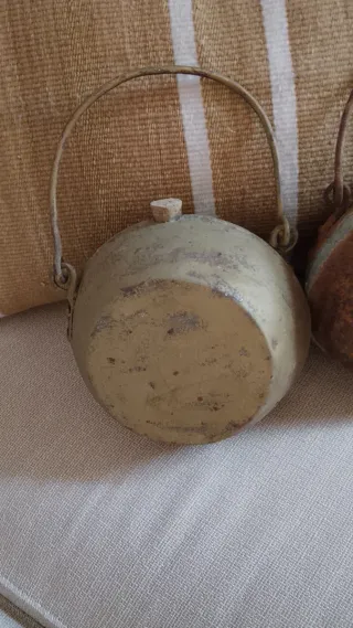 cantimplora antigua de hierro, con un diseño rústico y desgastado. - Material: Hierro. - Estilo: Antiguo. - Color: pintado Dorado