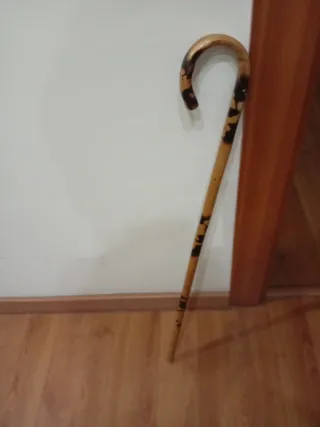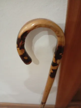 Bastón antiguo de madera con acabado barnizado. Su diseño curvo en el mango lo hace distintivo y rústico. - Ideal para decoración. - Material: Madera - Acabado: Barnizado - Diseño: Mango curvo