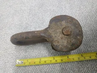 Pieza de polea antigua fabricada en hierro forjado. Su diseño robusto y su material le otorgan un carácter rústico y vintage. Medida de 12x5cm - Material: Hierro forjado. - Estilo: Antiguo/Vintage.