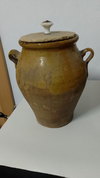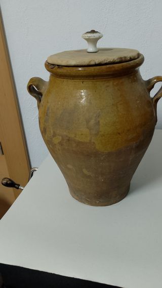 Orza antigua de barro con tapa de madera