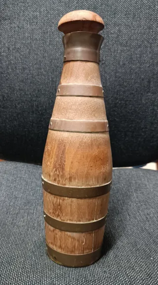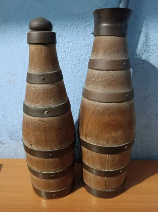 Conjunto de dos botellas antiguas con un diseño inspirado en barriles,Material: Madera y metal, Diseño único,creo que son francesas,Ideales para decoración o para usar, más cosas en mi perfil.