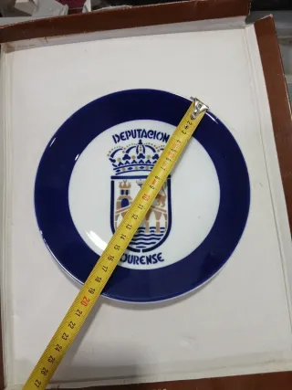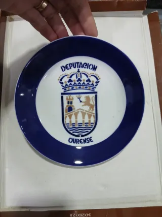 Plato decorativo con el escudo de la Diputación de Ourense. - Borde azul. - Diseño central con escudo y corona. - Inscripción DIPUTACION y OURENSE.