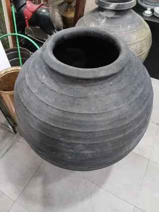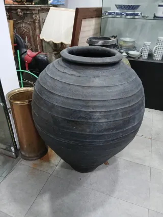 Tinaja antigua de gran tamaño en color negro. Su diseño rústico y sus dimensiones la hacen una pieza decorativa llamativa. SOLO RECOGIDA LOCAL DEBIDO AL TAMAÑO Y PESO DE LA PIEZA. 78cms de alto y 23cms de boca - Material: Cerámica o barro cocido. - Color: Negro. - Estilo: Rústico, antiguo.