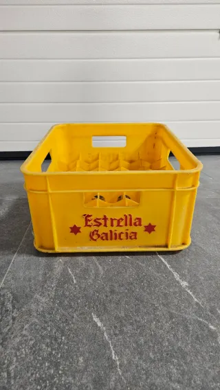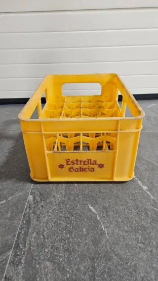 Caja de plástico amarilla para botellas de cerveza ( Tercios). - Marca: Estrella Galicia. - Color: Amarillo. - Material: Plástico resistente.