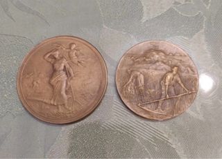 Conjunto de dos medallas antiguas con temática de agricultura, datan de principios del siglo XX. - Diseño detallado con escenas agrícolas. - Material de bronce o similar.