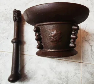 Mortero almirez de farmacia antiguo de gran tamaño y peso considerable (4 kg). Es una pieza excepcional difícil de ver. Mide 18 cm de diámetro y la mano 23 cm de largo. - Material: Hierro fundido. - Color: Marrón oscuro. - Diseño: Decorado con sendas caras mitológicas - Incluye su mano decorada también con cara como se puede apreciar en las fotos