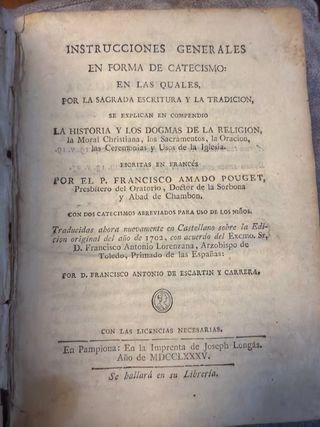 Se vende obra completa en 4 tomos de Instrucciones generales en forma de catecismo, impresa en Pamplona en 1785 en la Imprenta de Joseph Longás. Edición original del siglo XVIII, traducida del francés y autorizada por el Arzobispado de Toledo. Descripción • 4 tomos completos • Encuadernación original en pergamino • Papel original del XVIII • íntegro, sin páginas sueltas ni faltas de texto • Manchas y pátina propias de la época (foxing leve) • Lomos firmes, desgaste homogéneo y honesto • Anotaciones ex libris, de interés histórico Conservación muy buena para una obra de 1785. Conjunto sólido y perfectamente legible.