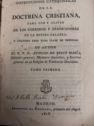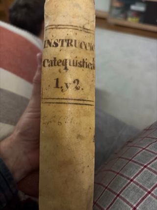 Instrucciones catequísticas de la doctrina cristiana – 1818 – Pergamino Se vende ejemplar original del siglo XIX de Instrucciones catequísticas de la doctrina cristiana. Autor: R. P. Fr. Antonio de Jesús María (Trinitarios Descalzos) Lugar y año: Madrid, Imprenta de Repullés, 1818 Volumen: Tomo primero (indicado en lomo como “I y 2”, encuadernación de época) Descripción • Encuadernación original en pergamino • Papel original del siglo XIX • Interior completo, sin páginas sueltas ni faltas de texto • Manchas y pátina propias del tiempo • Ejemplar sólido y perfectamente legible