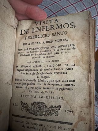 Visita de enfermos y ejercicio santo de ayudar a bien morir Autor: Fr. Antonio Arbiol (franciscano) Edición: Séptima impresión Lugar: Pamplona Año: 1760 Encuadernación: Pergamino original Formato: libro devocional de uso práctico