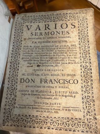 Libro Varios Sermones de Fray Juan Interián de Ayala, publicado en Madrid en 1720. - Segunda Parte. - Dedicado a Don Francisco Eustachio de Perea y Porras, Obispo de Plasencia. - Impreso por Eusebio Fernandez de Huerta.