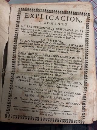 • Título: Explicación y comento de la Doctrina Cristiana • Autor: Fr. Francisco Xavier de Ávila (Carmelita) • Lugar y año: Salamanca, 1746 • Encuadernación: pergamino original • Estado: completo, papel original con manchas y desgaste lógico; encuadernación usada pero íntegra