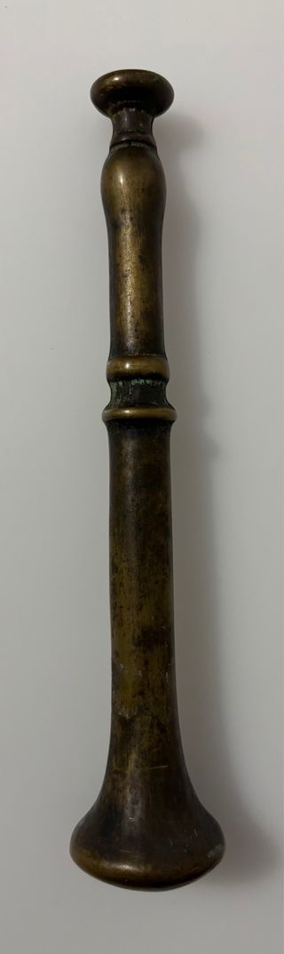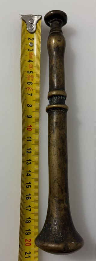 Machacador o “Mano” para Almirez o Mortero. Es de bronce fundido y muy antiguo. La empuñadura o mango tiene una longitud de 20 cms. y el diámetro de la base de golpeo es de 4 cms.