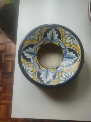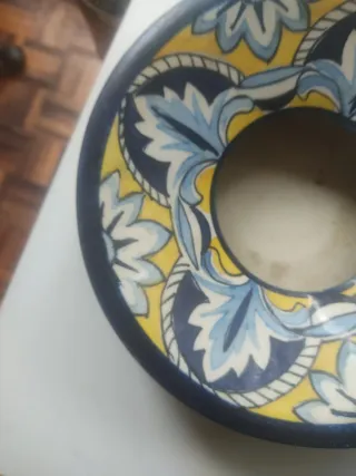 Pieza antigua con un diseño floral y geométrico muy llamativo. - Decoración en tonos azul, amarillo y blanco. - Borde exterior en color azul oscuro. - Diseño circular con un hueco central.