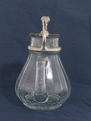 Original y vintage jarra de cristal templado de la casa Fages de Barcelona. De los años 20/30. Con detalles metálicos característicos y tapa de plástico. Medidas: 15 cm. de ancho y 18 cm. de alto. Pesa 600 gramos.