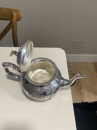 Elegante tetera con un diseño clásico y ornamentado. - Bañada en plata. - Patas decorativas. - Tapa con figura de ave. - Grabados florales detallados. -Manchester Design.