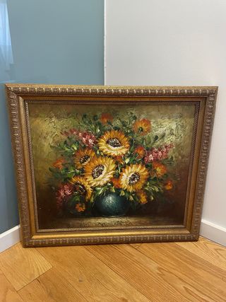 Precioso cuadro pintado al óleo con un bodegón de flores y girasoles - Marco dorado en pan de oro con detalles. - Pintura al oleo - Año 1967 Medidas 73 cm x 64 cm