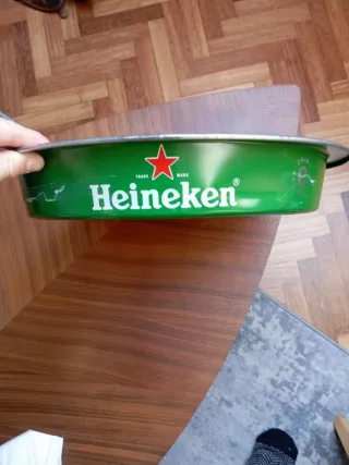 Bandeja redonda con el logo de Heineken. Comprada en fabrica de Amsterdam - Diseño circular con borde plateado. - Ilustración central verde con el nombre de la marca y detalles. - Ideal para coleccionistas o decoración temática.