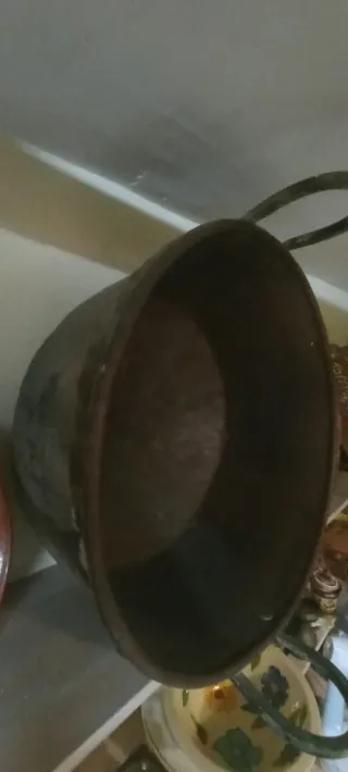 Caldera de cobre antigua, ideal para matanza. Un objeto con historia y carácter,está tiene más de 100 años y es completamente hecha a mano por un artesano, tiene 66cm de diámetro y alrededor de 40cm de fondo. Su peso calculo que tiene alrededor 20kilos - Material: Cobre. - Diseño: Tradicional con asas. - Uso: Decorativo o para coleccionistas.