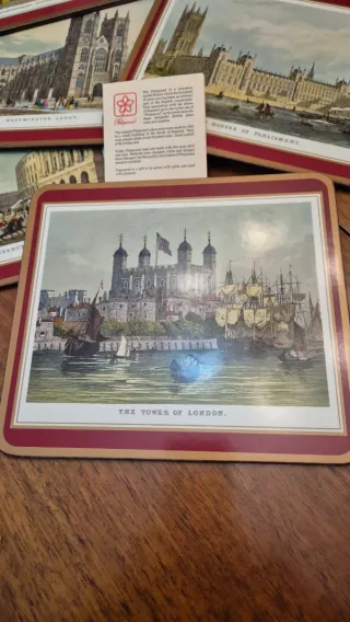 Set de salvamanteles de la reconocida marca Pimpernel con vistas de Londres. - Diseño con escenas históricas de Londres. - Borde decorativo en color burdeos. - Incluye caja original. Firma darte de la colección de Luxe Tradicional colectivo.año 1960-69