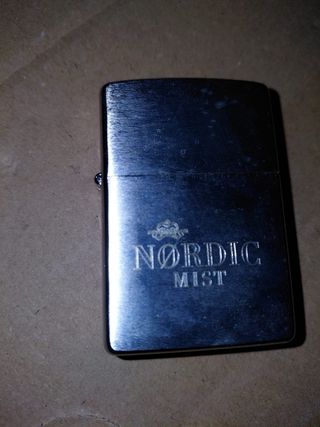 Mechero tipo Zippo con acabado metálico plateado. Presenta un diseño grabado con el nombre NORDIC MIST y un pequeño emblema. - Material: Metal. - Color: Plateado. - Grabado: NORDIC MIST.