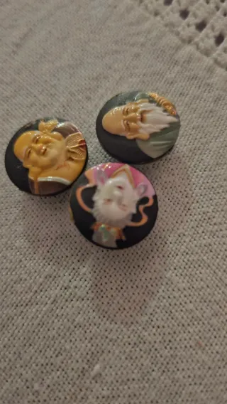 Conjunto de tres botones antiguos con diferentes rostros. - Diseño de caras orientales. - Ideal para coleccionistas o manualidades.