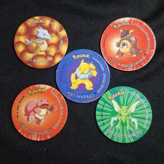 Conjunto de 5 tazos de Pokémon. - Puedes pedir más fotos si las necesitas :) - Son los originales de Matutano del año 2000 / 2001 (mi propia colección) - Como nuevos, a excepción de Kangaskhan, que está un poco gastado, y algún pequeño defecto o rasguño en los demás. - Tazo de Marowak (#105). - Tazo de Kangaskhan (#115). - Tazo de Hypno (#97). - Tazo de Lickitung (#108). - Tazo de Scyther (#123).